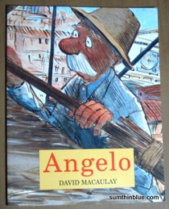 This book is a straight narrative, but I actually enjoyed it even more than Shortcut. Angelo is not your typical storybook fare, but it’s surprisingly endearing, both funny and heartrending in turn, but very very subtle. I found my breath catching in my chest, and tears smarting towards the end, and very few picture books (and I’ve read a LOT) have had that same effect on me. Macaulay’s illustration style for this book underscores its theme — he uses a more muted palette and brown outlines (instead of his usual black) in this book, lending it a softer feel. The book showcases a different facet to Macaulay’s work, his intricate art enriched by a wealth of emotion.