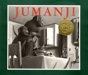 Jumanji is a Caldecott awardee, and Chris van Allsburg’s illustrations, are as always, superb. Monochromatic pencil drawings, clean lines, and masterful use of the play of light and shadow — his art never fails to awe me.